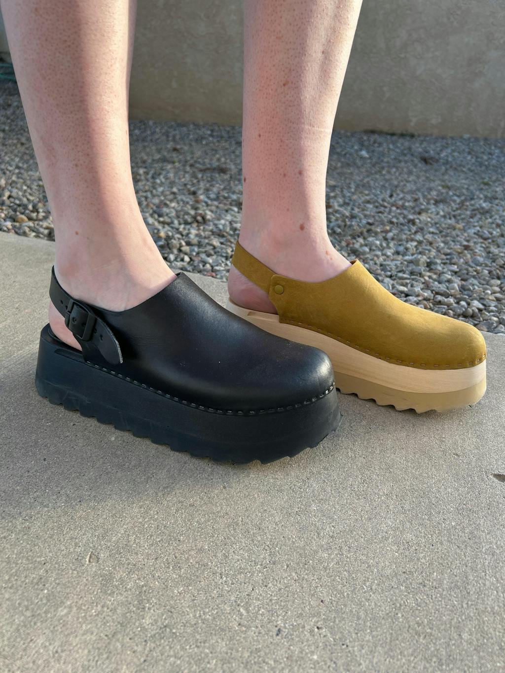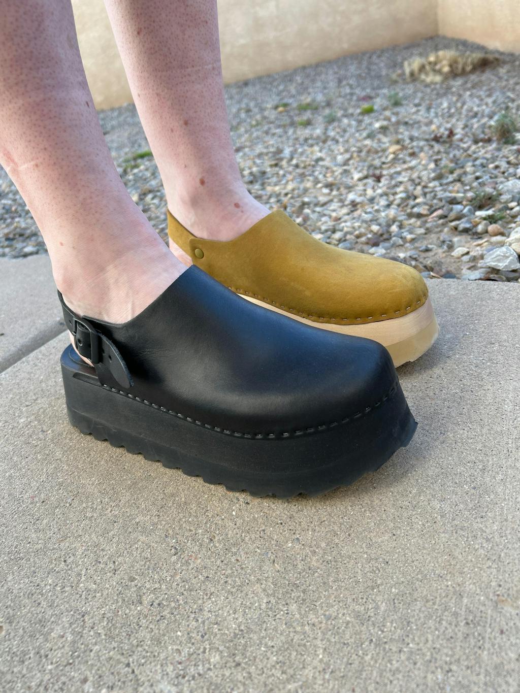 Clogs just got a LOT more edgy and fun. With its bold chunky style that's a nod to the 90's, our unique Tegan really is a new way to wear a clog. Featuring an orthopedic, hand-carved, solid wood base that has arch support built right in. The upper is made of gorgeous US high grade leather that wears in beautifully. The back strap holds you comfortably in. You can wear the chonk all day and look stylish and feel comfortable.